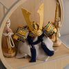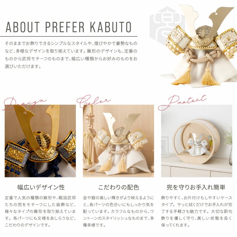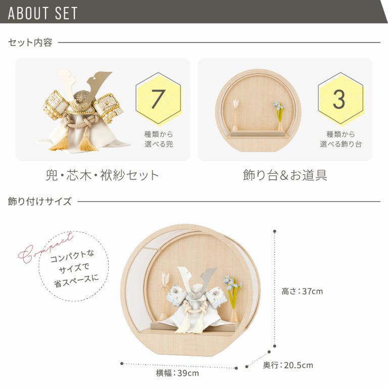 煌々とした輝きを放つコンパクトで美しいインテリア兜飾り。華やかな装飾はおめでたい端午の節句にもぴったり。人気の金銀の兜は、力強さと高貴さを感じる絢爛豪華な節句飾りです。伝統的な兜飾りと現代のインテリアが調和するように、明るめの木目調シートでナチュラルな雰囲気を演出する飾り台。五月人形を引き立てる脇飾りは、お部屋や兜に合わせてお好みのものをお選びください。輪を描く丸型もスタイリッシュでお部屋に華を添えます。ケースタイプなのでお手入れも簡単です。