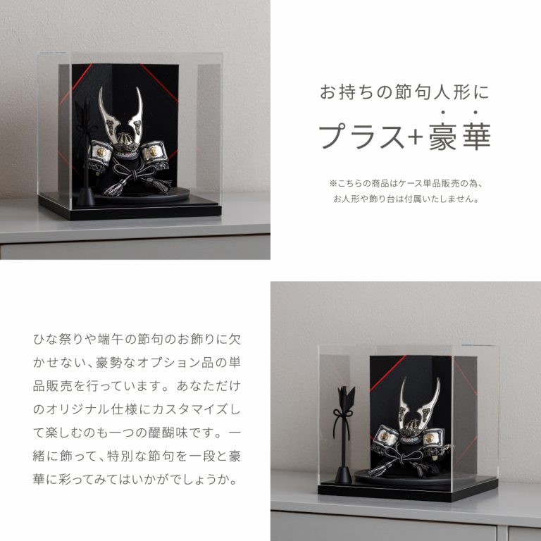大切な五月人形をキズやホコリから優しく保護する、横幅24cmのアクリルケース。空間に溶け込むおしゃれなデザインと、周囲のインテリアを損なわない、お手軽に飾れるコンパクトサイズを実現しました。和室はもちろんモダンな洋室にもぴったり。マットに仕上げた黒の土台が、兜飾りの輝きをいっそう引き立ててくれます。こどもの日や端午の節句に欠かせない5月人形を美しく保ってくれるケース飾り。プラスアイテムとして、初節句のお祝いギフトにいかがでしょうか。