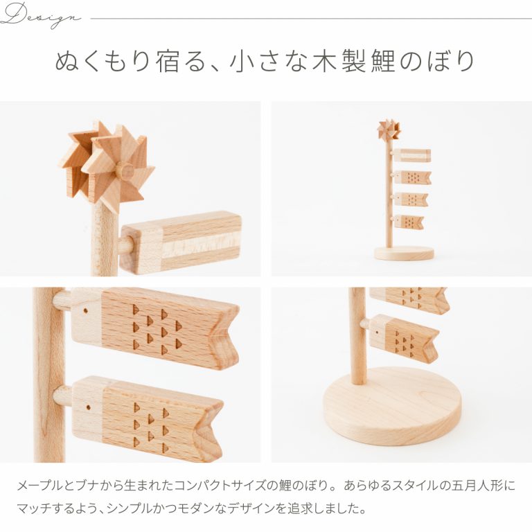 木ならではの優しいぬくもりが五月人形を彩る、コンパクトでかわいい木製鯉のぼり。お手持ちの兜飾りにシンプルモダンなアクセントをプラスします。インテリアとして通年で飾っていたくなるようなおしゃれなデザイン。あらゆるスタイルの5月人形と好相性です。省スペースで飾れる小さいサイズのこいのぼりなので場所を取りません。こどもの日や端午の節句といった男の子のハレの日を、優しく彩ってくれるでしょう。初節句のお祝いギフトにもおすすめです。
