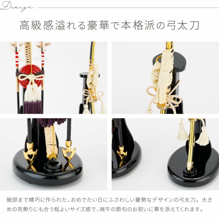 節句飾りを豪華に彩るコンパクトな弓太刀。ハチクマ模様の矢羽根や金色に輝く矢尻が高級感を醸し出す弓。紫色の飾り房やアイボリーの太刀緒など美しい色使いが際立つ太刀。細部まで作り込まれた装飾やモダンなデザインが兜飾りを美しく引き立たせ、端午の節句を豪華に演出します。手軽に飾れる小さいサイズ感ながら見応えがあり、おしゃれなインテリアにもおすすめです。
