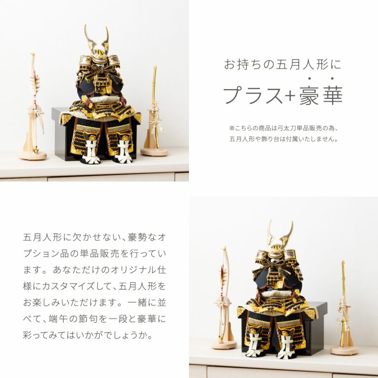 節句飾りを彩る程よい大きさの弓太刀。4種類のデザインをご用意しました。細部まで作り込まれた繊細な装飾が兜飾りを美しく引き立たせ、端午の節句を豪華に演出します。ナチュラルな木目が美しい弓太刀飾りは、スプルスやブナの無垢素材を使用。手軽に飾れる小さいサイズ感ながら見応えがあり、インテリアにもおすすめです。現代のどんな空間にも合うモダンなデザインで兜飾りをおしゃれに彩り、お部屋に華を添えてくれます。