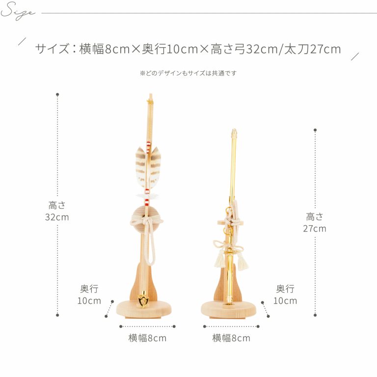 弓:横幅8cm×奥行10cm×高さ32cm太刀:横幅8cm×奥行10cm×高さ27cm