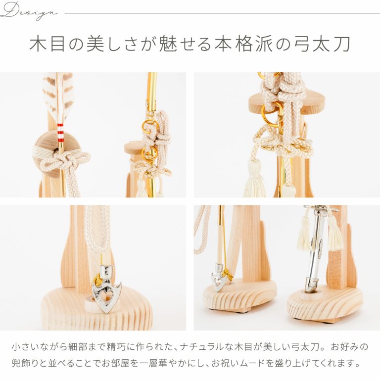 節句飾りを彩るコンパクトな弓太刀。2種類からお選びいただけます。細部まで作り込まれた繊細な装飾やモダンなデザインが兜飾りを美しく引き立たせ、端午の節句を豪華に演出します。木目の美しい弓太刀飾りには、スプルスやブナの無垢素材を使用。手軽に飾れる小さいサイズ感ながら見応えがあり、インテリアにもおすすめです。木のぬくもりを感じるおしゃれな弓太刀が兜飾りを優しく彩り、お部屋に華を添えてくれます。