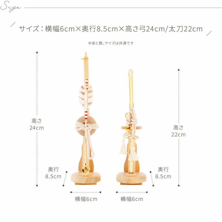 弓:横幅6cm×奥行8.5cm×高さ24cm太刀:横幅6cm×奥行8.5cm×高さ22cm