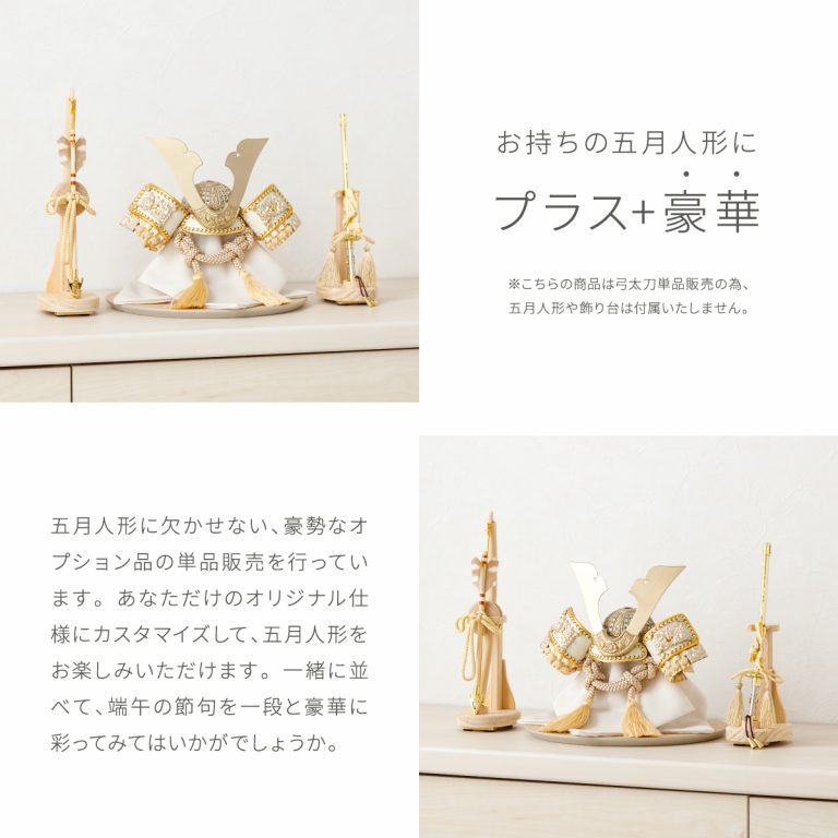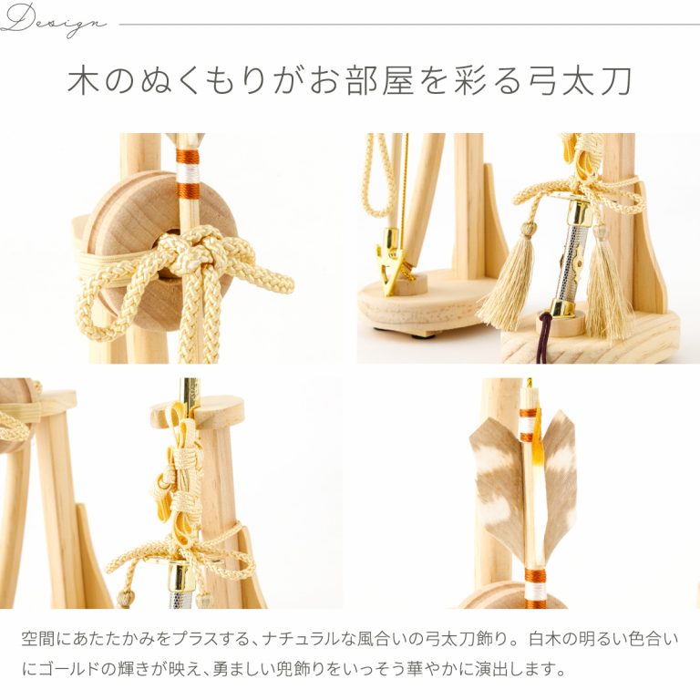 五月人形をもっと華やかに演出する、美しい木目が印象的な弓太刀飾り。白木材に繊細な装飾を施し、コンパクトながら見ごたえ抜群の脇飾りに仕上げました。木の質感を活かしたナチュラルモダンなデザインは、どんな兜飾りとも好相性。小さいサイズなので場所を取らず、おしゃれなインテリアのようにお楽しみいただけます。端午の節句やこどもの日には欠かせない、かっこいい節句飾り。初節句のお祝いやギフトにもおすすめです。