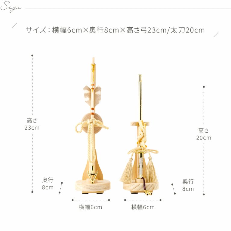 弓:横幅6cm×奥行8cm×高さ23cm太刀:横幅6cm×奥行8cm×高さ20cm