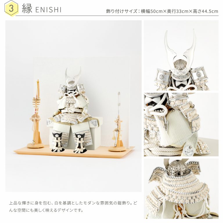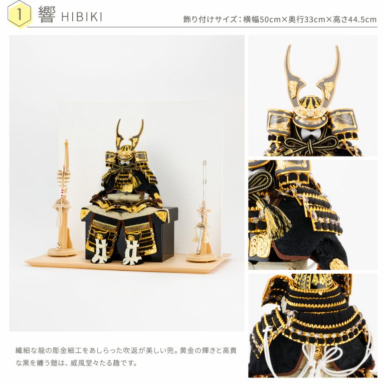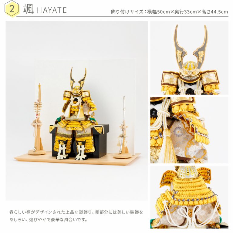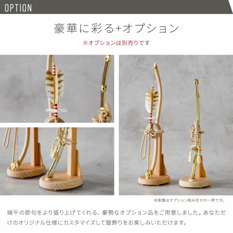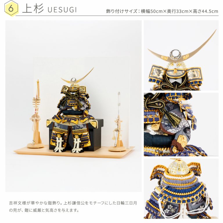 気軽に飾れる小さいサイズながら本格的に作り込まれた質の高い鎧飾り。伊達政宗や上杉謙信など名だたる戦国武将の鎧をモチーフに、飾りやすいコンパクトな大きさに仕上がっています。繊細な彫金細工を施した気品溢れる節句飾りはおめでたい初節句にもおすすめです。勇壮な五月人形に華を添える、明るい肌目の国産檜(ひのき)を使用した木製台と趣のある和紙の二曲屏風。そこに木目の美しい弓太刀が付属した豪華な飾り台セットです。自然な温かみを取り入れつつ、勇ましい鎧の豪奢な姿が際立つデザインで端午の節句を彩ります。