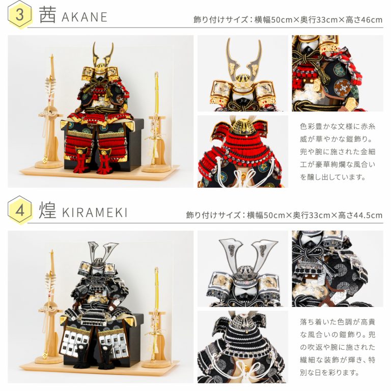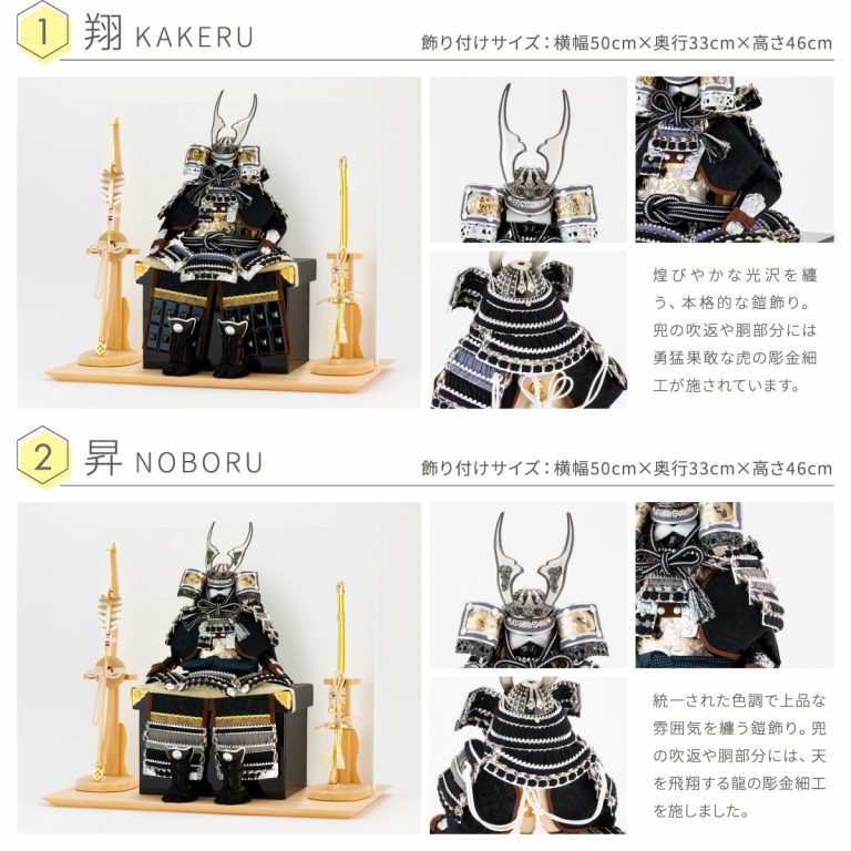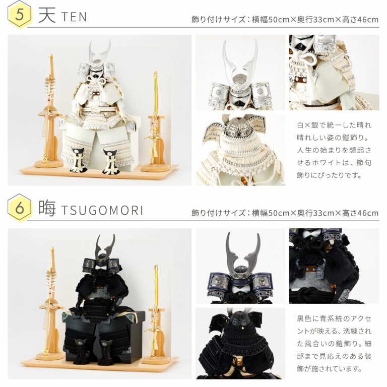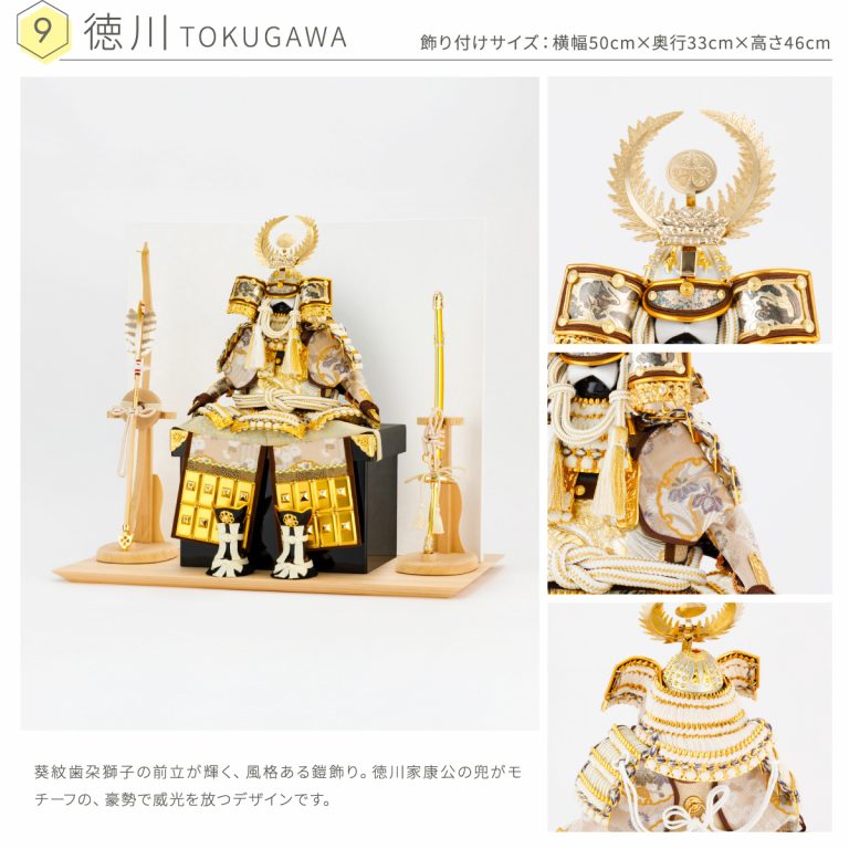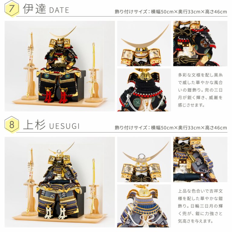 どの角度から見ても美しい、匠の技が詰まった鎧の節句飾り。人気の高い伊達政宗や徳川家康など名だたる戦国武将をモチーフにした本格的な鎧飾りを、コンパクトで飾りやすい大きさに仕上げました。統一感のある色味や伝統的な文様を組み合わせて作られた鎧飾りは、おめでたい初節句やインテリアにもおすすめです。勇壮な五月人形に華を添える木製台には、明るい肌目が美しい国産檜(ひのき)を使用。趣のある和紙の二曲屏風を合わせました。そこに木目の美しい弓太刀が付属した豪華な飾り台セットです。自然な温かみを取り入れつつ、勇ましい鎧の豪奢な姿が際立つデザインで端午の節句を彩ります。