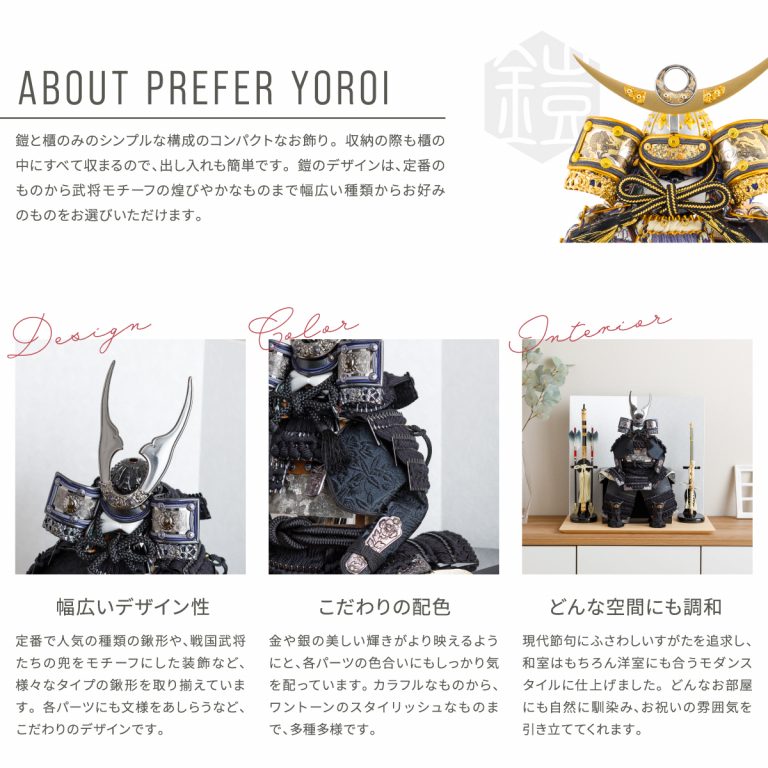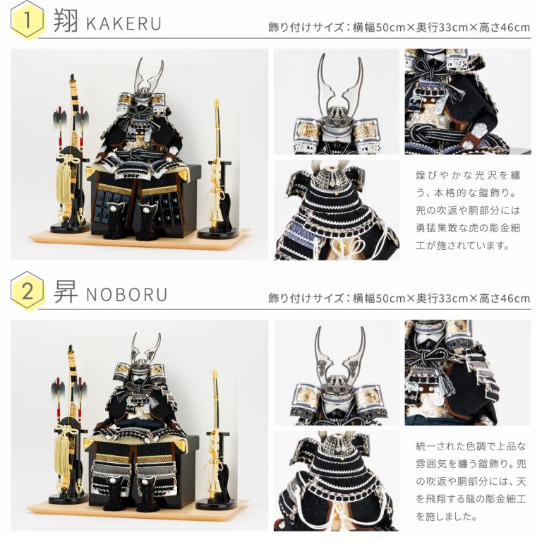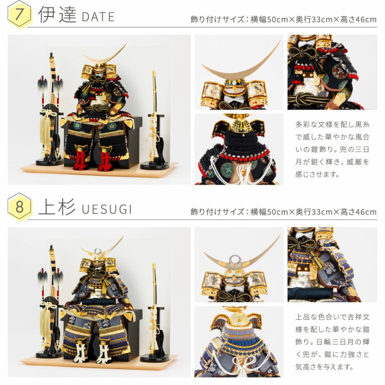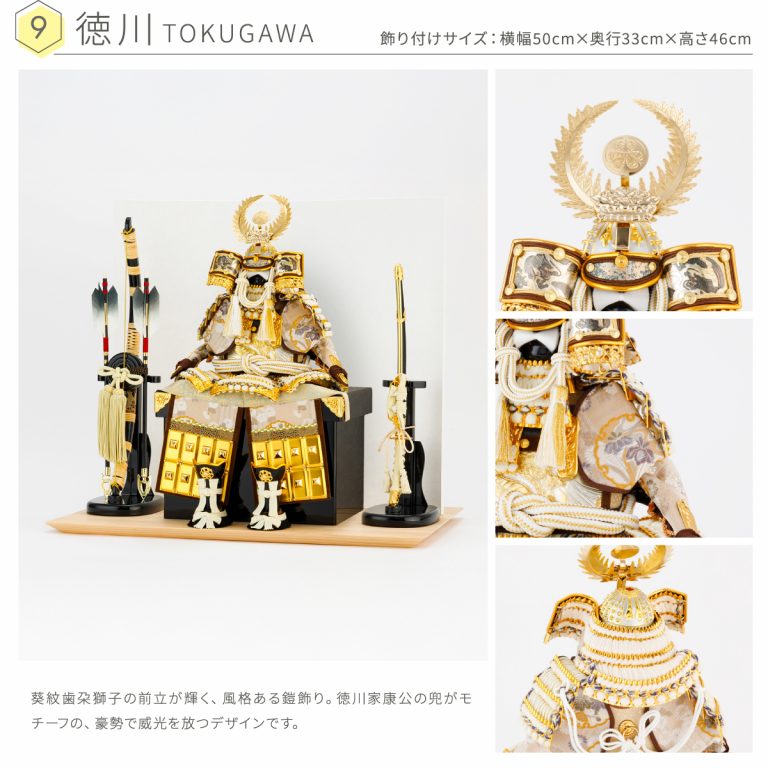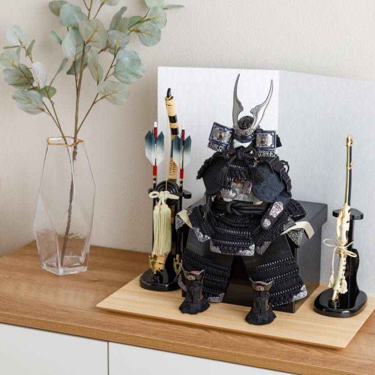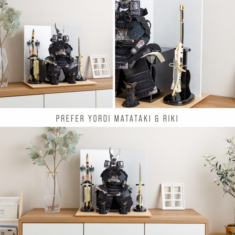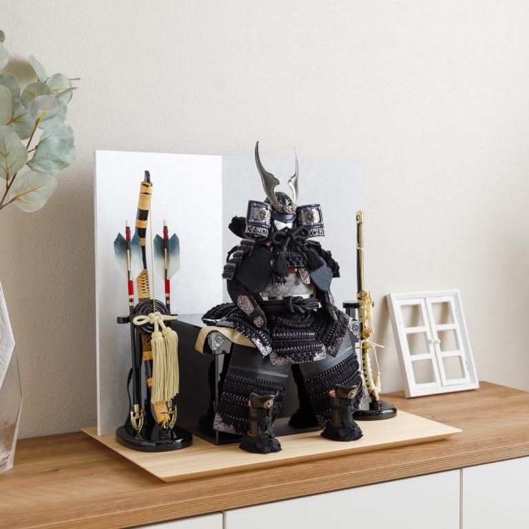 どの角度から見ても美しい、匠の技が詰まった鎧の節句飾り。人気の高い伊達政宗や徳川家康など名だたる戦国武将をモチーフにした本格的な鎧飾りを、コンパクトで飾りやすい大きさに仕上げました。統一感のある色味や伝統的な文様を組み合わせて作られた鎧飾りは、おめでたい初節句やインテリアにもおすすめです。勇壮な五月人形に華を添える木製台には、明るい肌目が美しい国産檜(ひのき)を使用。趣のある和紙の二曲屏風を合わせました。さらに勇ましくも上品な風合いの弓太刀が付属した豪華な飾り台セットです。鎧が引き立つよう程よくシンプルにデザインし、味わい深い風合いで端午の節句を彩ります。