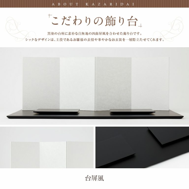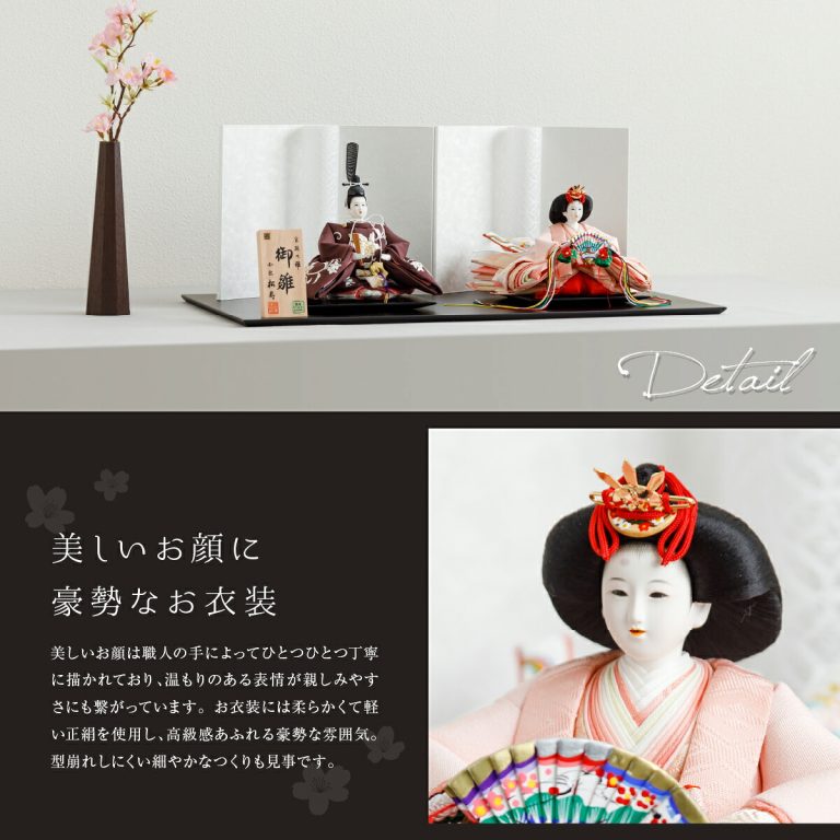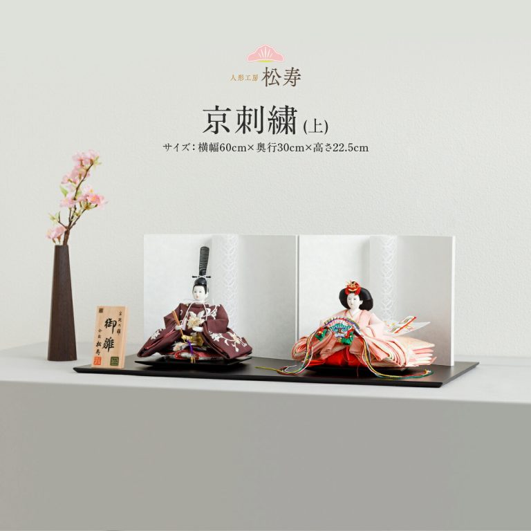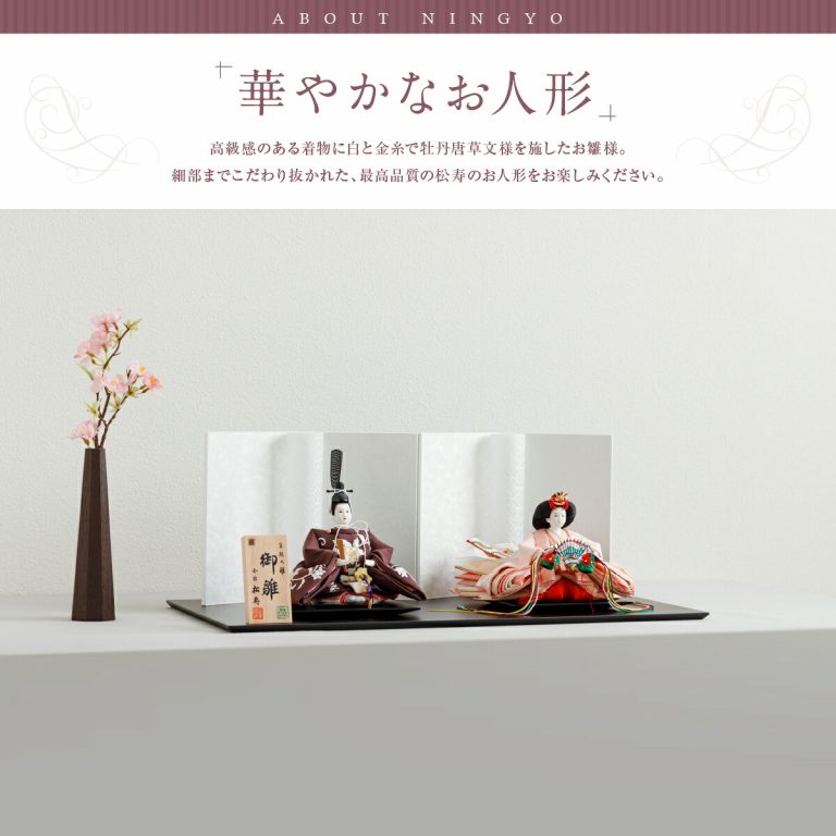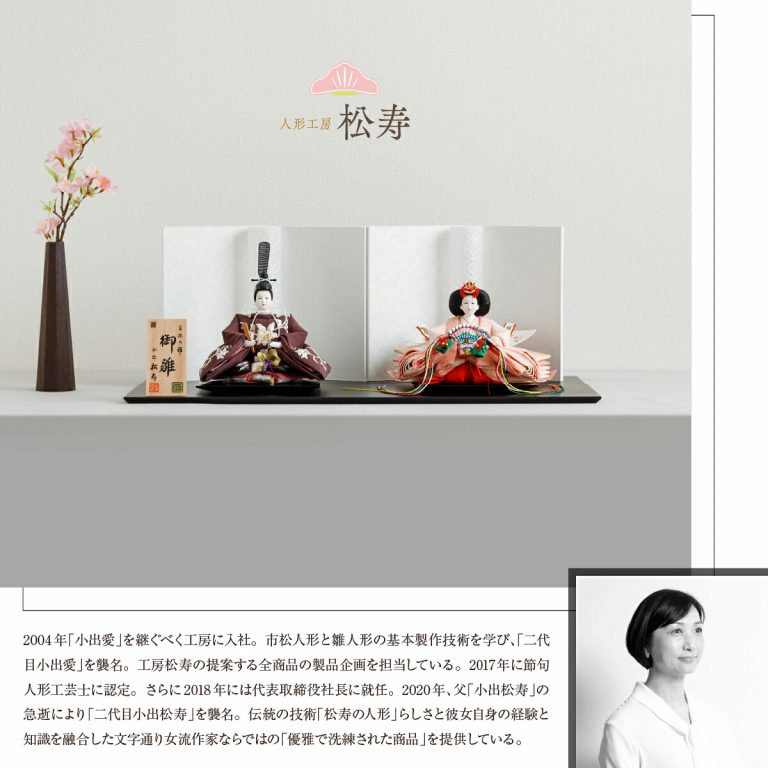小出松寿が主宰する人形工房「松寿」。顔・髪・頭・道具・手足それぞれ専門の職人が分業で生み出す、最高品質の雛人形です。上品な色の着物に、牡丹唐草模様を施したお衣装を纏う格調高い親王飾り。マットな黒塗の台座にシンプルな白屏風を合わせたモダンな飾り台は、お雛様の美しさが際立つデザインです。職人たちがこだわり抜いた松寿の可愛いひな飾りは、初節句などおめでたい日にぴったり。お祝いギフトにもおすすめです。コンパクトサイズのかわいいおひな様なので、おしゃれなインテリアのように飾っていただけます。