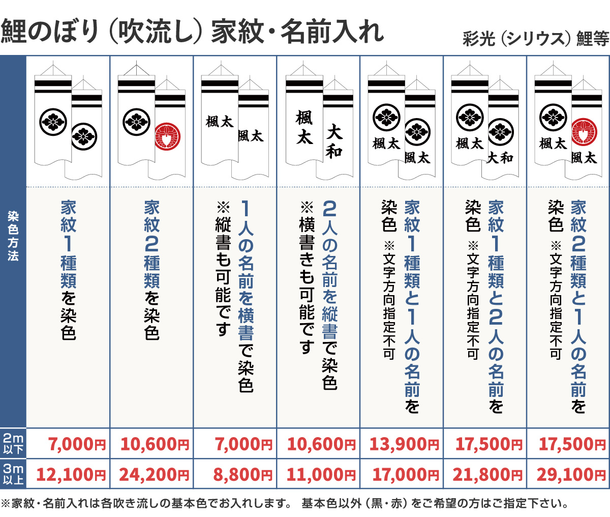 家紋色は、ご購入いただいた鯉のぼりの吹流しの基本色でお入れいたします。 基本色につきましては、各鯉のぼりの商品ページにてご確認ください。