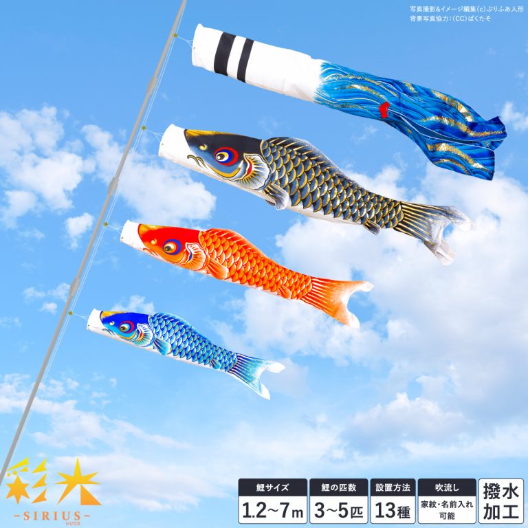 鯉のぼり ベランダ こいのぼり 庭 SIRIUS 彩光鯉 シリウス 撥水加工 おしゃれ 1.2m 1.5m 2m 3m 4m 5m 6m 7m 鯉3匹 4匹 5匹 スタンダード プレミアム スタンド 格子金具 万能万力 koiらく 杭打ちポール