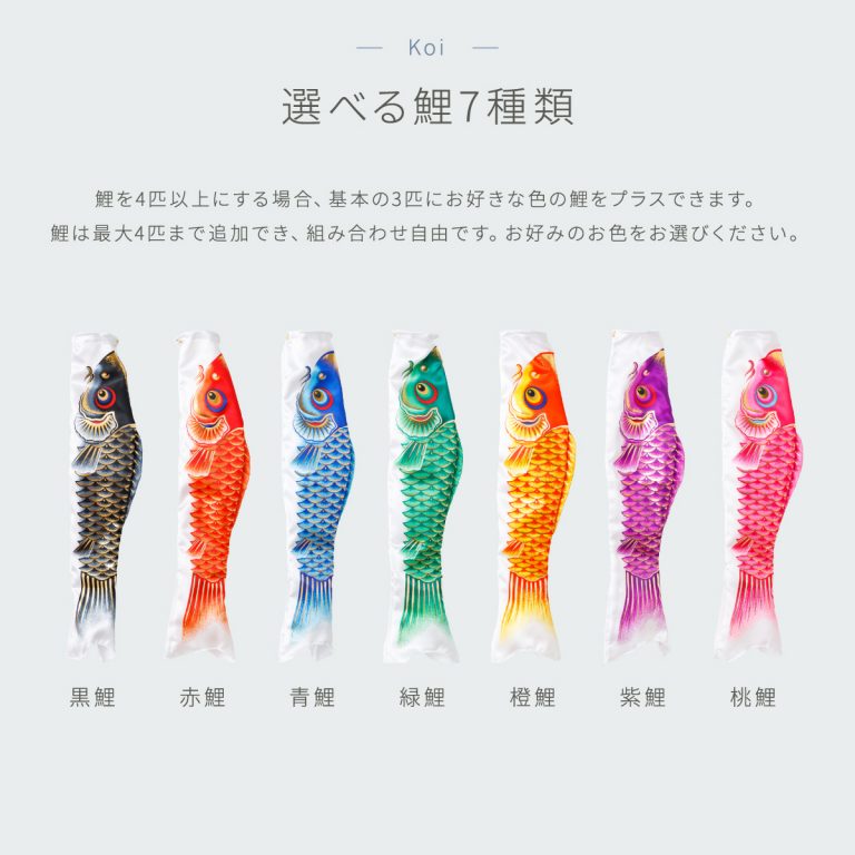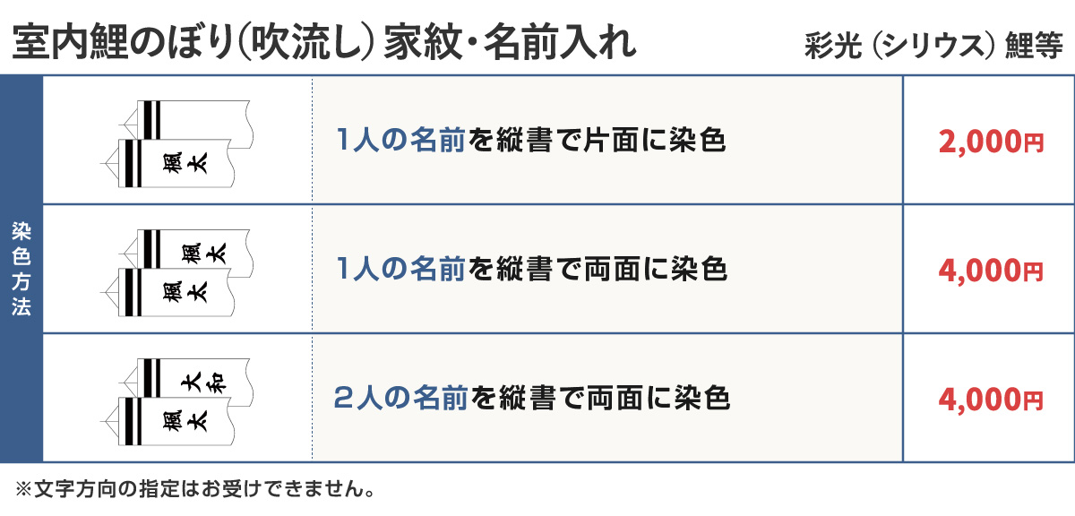 文字色は、ご購入いただいた鯉のぼりの吹流しの基本色でお入れいたします。 基本色につきましては、各鯉のぼりの商品ページにてご確認ください。
