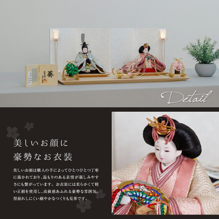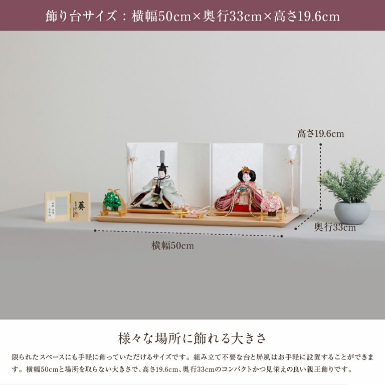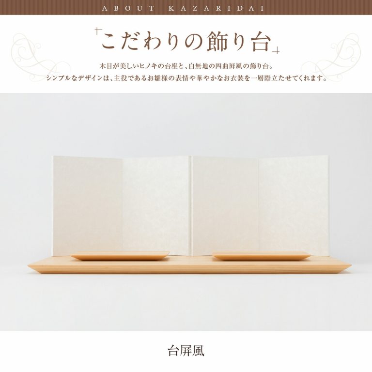 女流作家、柴田家千代作のお雛様です。流水文様があしらわれたかわいいお衣装を纏う、華やかな親王飾り。木目が美しいヒノキの台座と白屏風を合わせたモダンな飾り台が、おひな様を上品に引き立てます。コンパクトなので、本格派ながら簡単に飾ることができます。高貴で麗しい雰囲気の雛人形は、おめでたい日にぴったり。可愛いお子様の初節句にもおすすめです。おしゃれなデザインでインテリアのようにも飾っていただける、小さいサイズのひな飾りです。