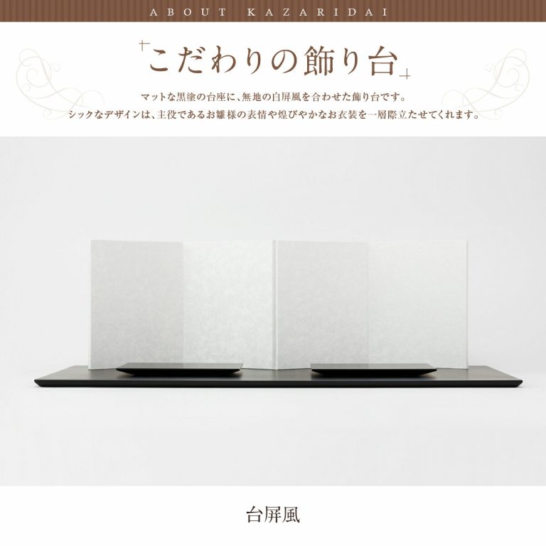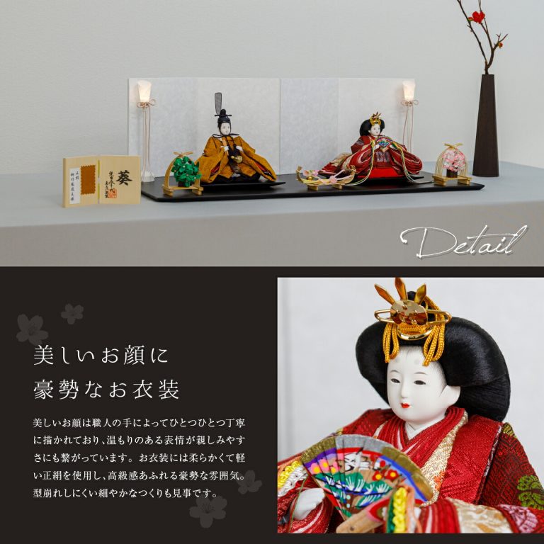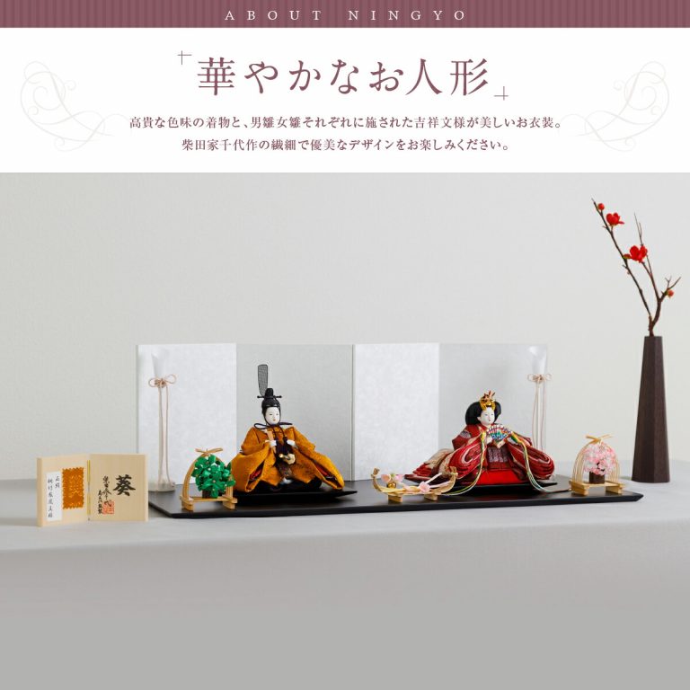 女流作家、柴田家千代が手がける高貴で麗しいお雛様です。吉祥文様があしらわれた美しいお衣装を纏う、華やかな親王飾り。黒塗の台座と白屏風を合わせたシンプルな飾り台が、かわいいおひな様を上品に引き立てます。コンパクトなので、本格派ながら簡単に飾ることができます。初節句など、お子さまのおめでたい日にぴったりのひな飾り。モダンかつおしゃれなデザインはインテリアにもオススメです。