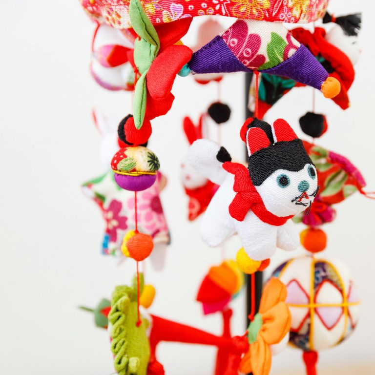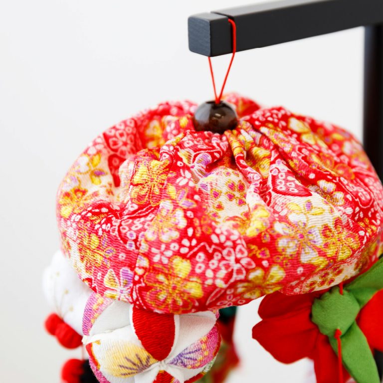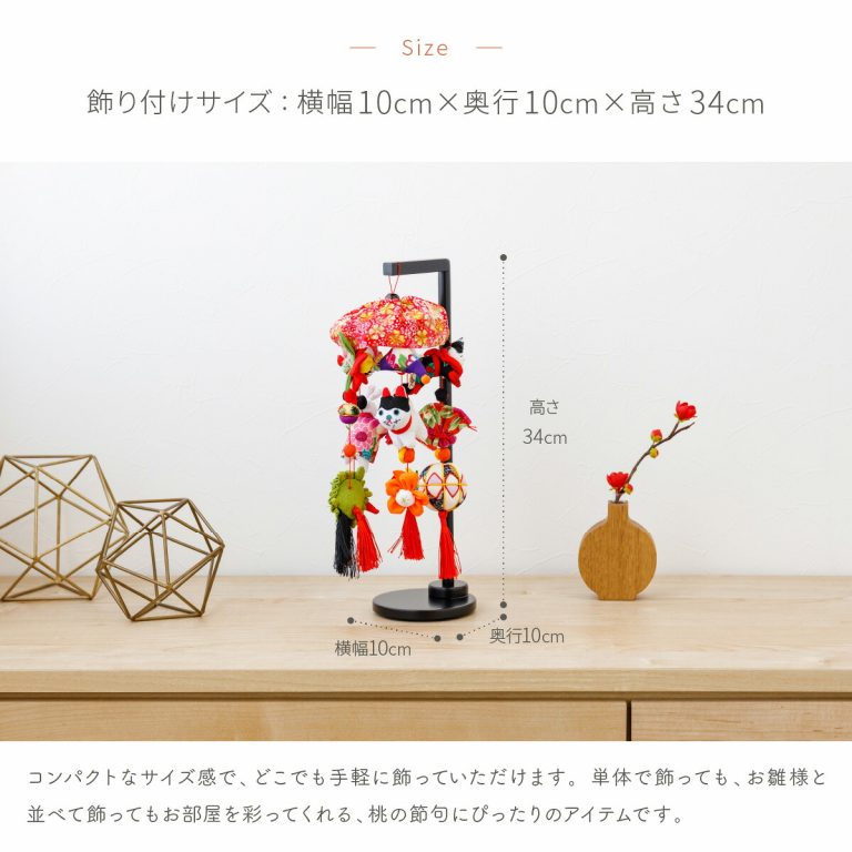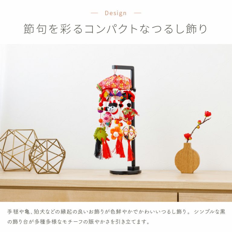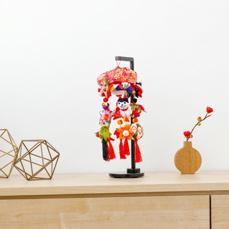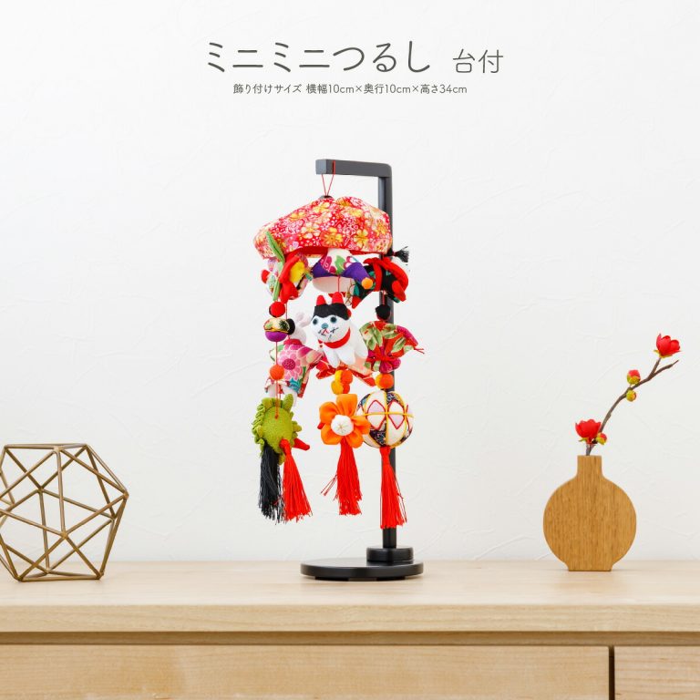 縁起の良い細工物がたくさん付いた、吊るし台付きのミニつるし飾り。「衣食住に困らないように」という願いが込められています。伝統的なつるし雛をモダンに、そしてコンパクトかつおしゃれに仕上げました。温かみのあるちりめん素材でできたかわいい吊るし飾りは、初節句のお祝いにもぴったり。お雛様をより華やかに彩ります。小さいので場所を選ばず、インテリアのように飾っていただけます。
