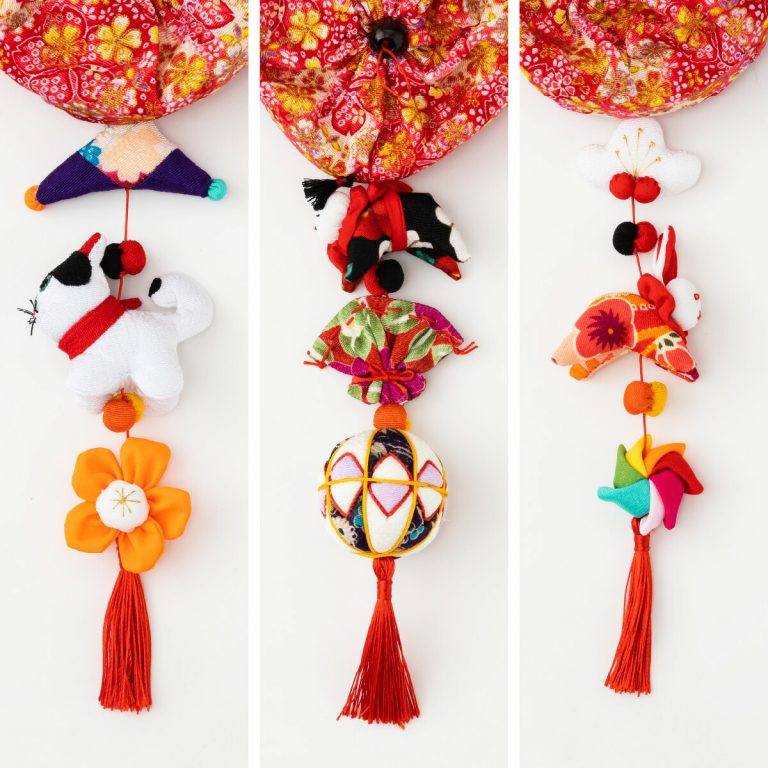 縁起の良い細工物がたくさん付いた、吊るし台付きのミニつるし飾り。「衣食住に困らないように」という願いが込められています。伝統的なつるし雛をモダンに、そしてコンパクトかつおしゃれに仕上げました。温かみのあるちりめん素材でできたかわいい吊るし飾りは、初節句のお祝いにもぴったり。お雛様をより華やかに彩ります。小さいので場所を選ばず、インテリアのように飾っていただけます。