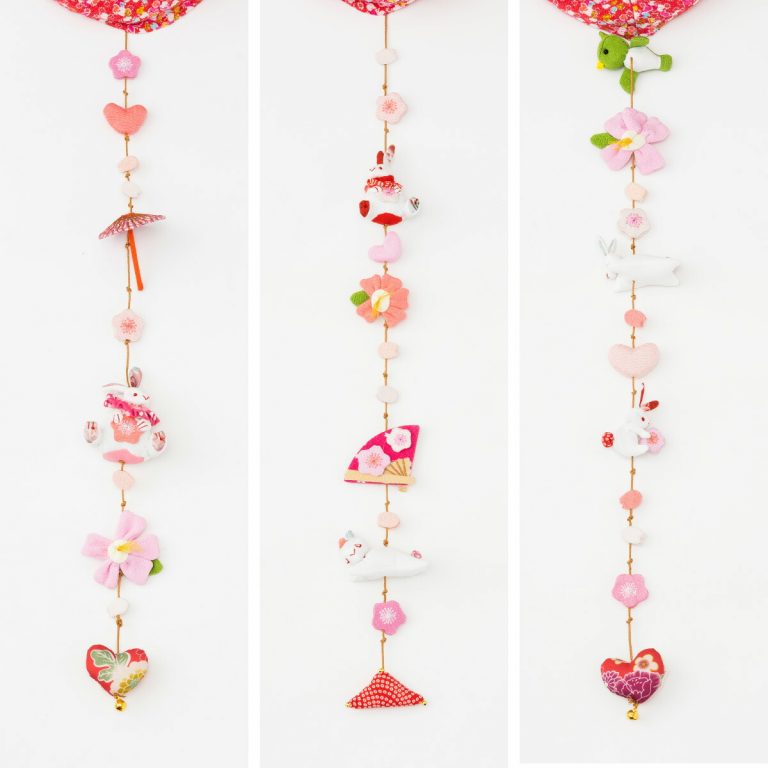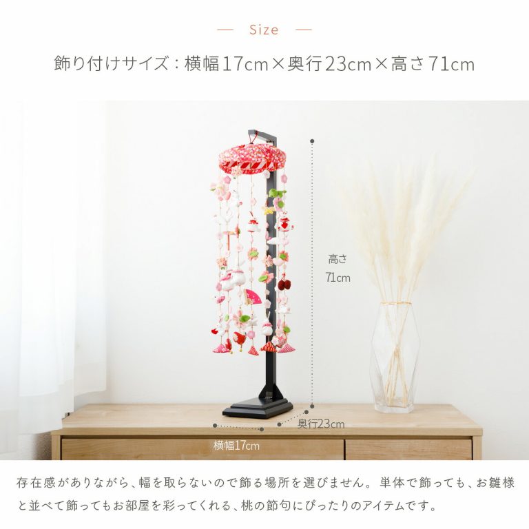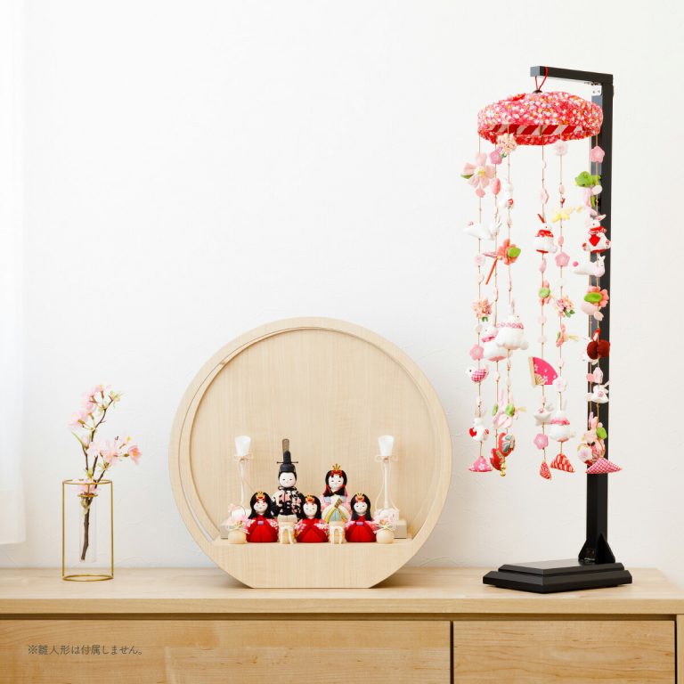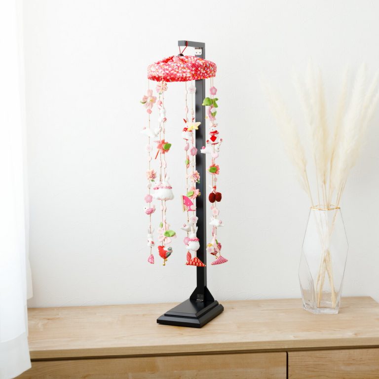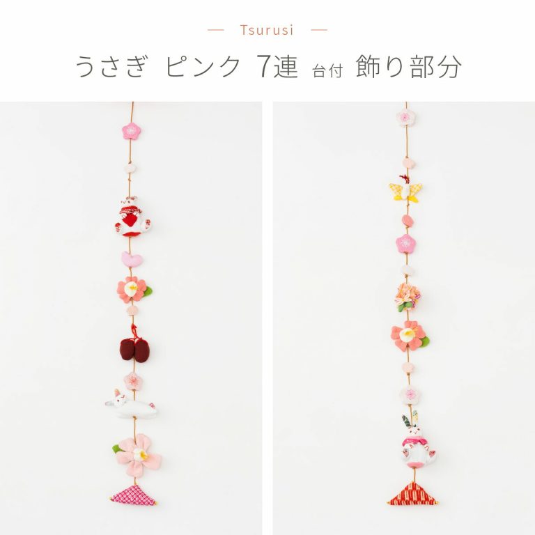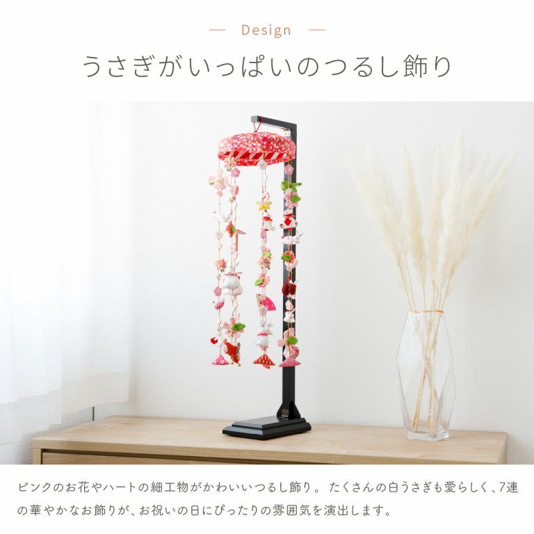 ピンクのかわいい細工物やたくさんのうさぎが華やかなスタンド付きつるし飾り。「衣食住に困らないように」という願いが込められています。伝統的なつるし雛をモダンに、そしてコンパクトかつおしゃれに仕上げました。7連の様々なモチーフがかわいい吊るし飾りは、初節句のお祝いにもぴったり。お雛様をより華やかに彩ります。