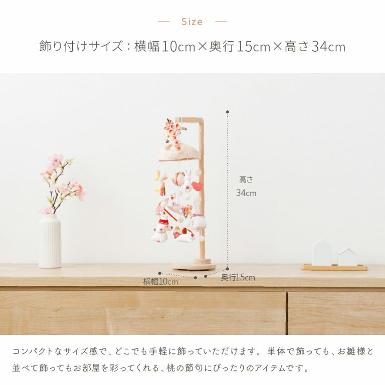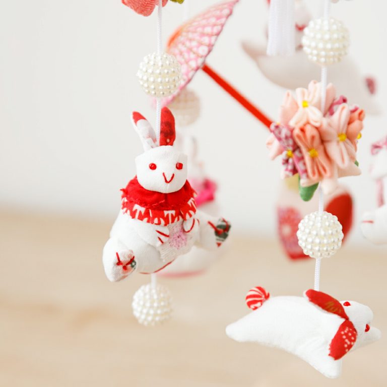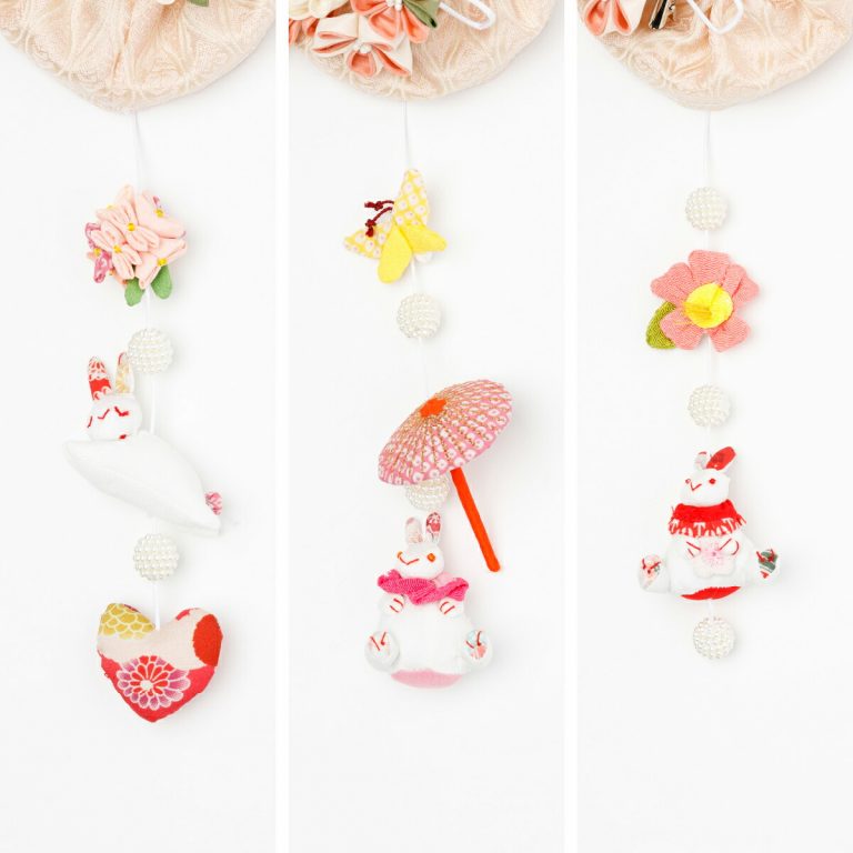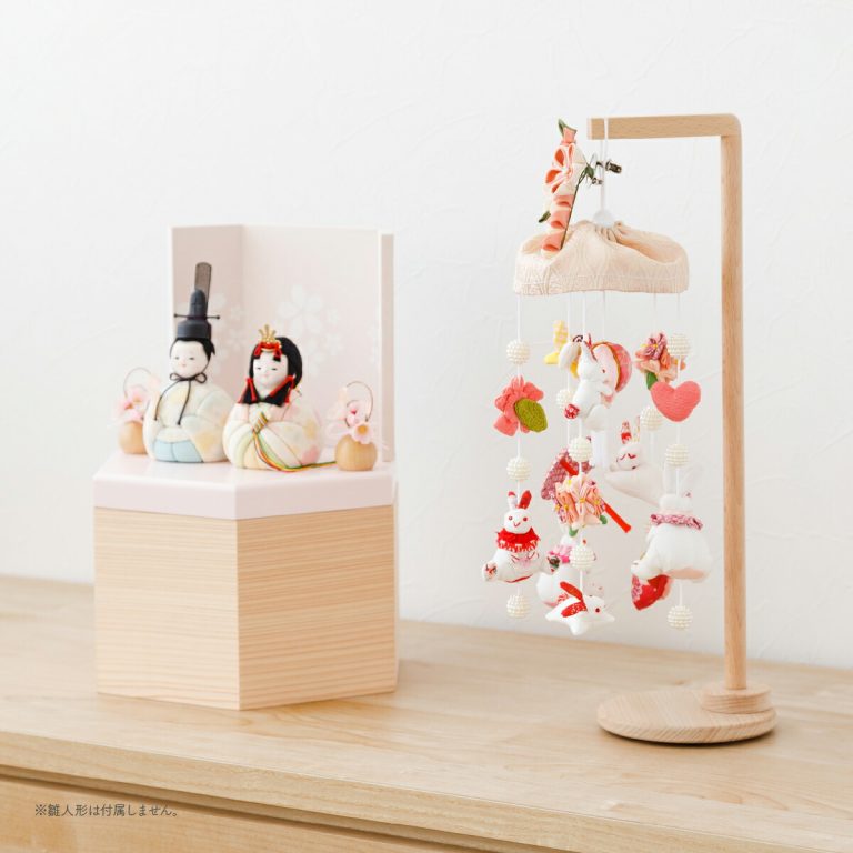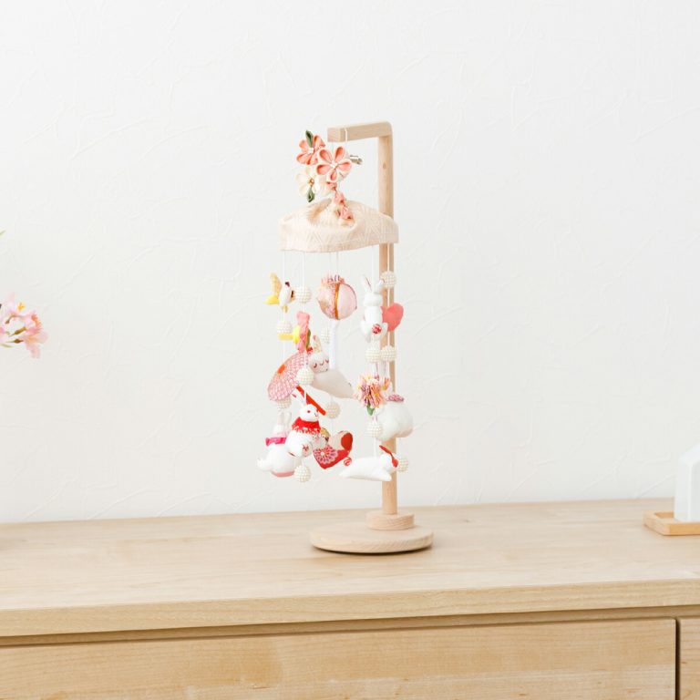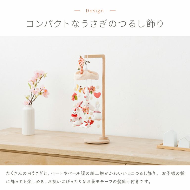 華やかな細工物やかわいい白うさぎがたくさん付いた、スタンド付きのモダンなつるし飾り。「衣食住に困らないように」という願いが込められています。女の子らしい様々なモチーフが可愛いつるし雛は、初節句などおめでたい日のお祝いにぴったり。お雛様をより華やかに彩ります。飾りやすいコンパクトサイズで、どんな空間にも合うおしゃれなデザインに仕上げました。
