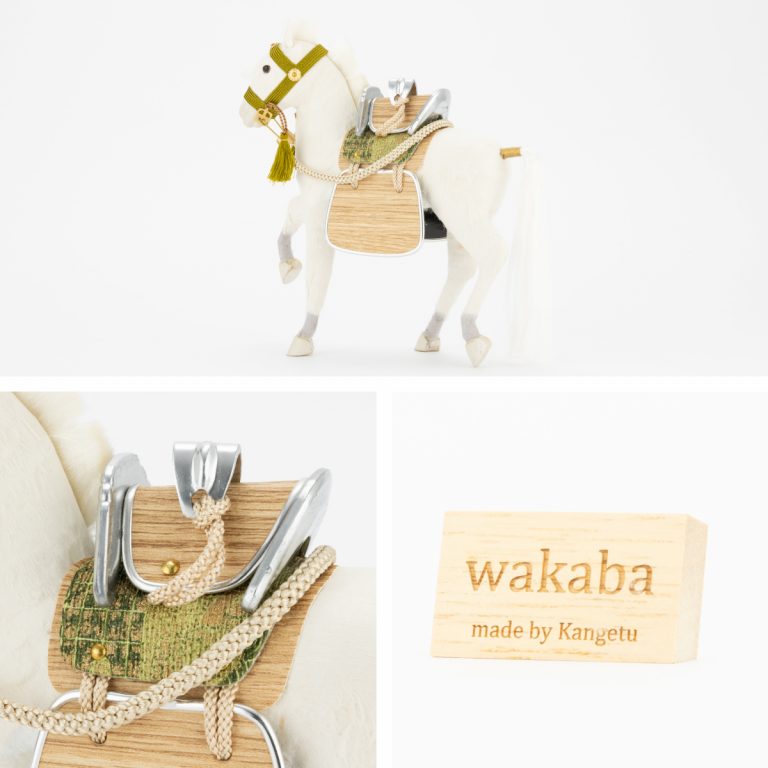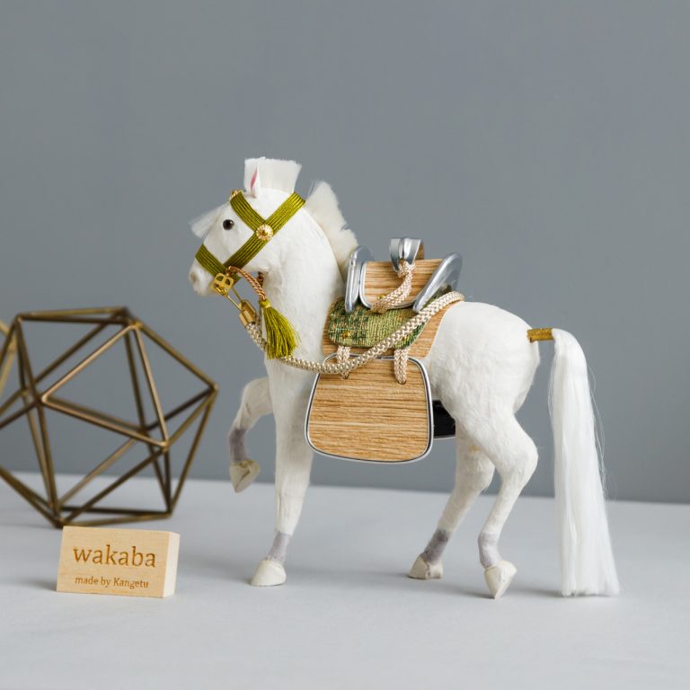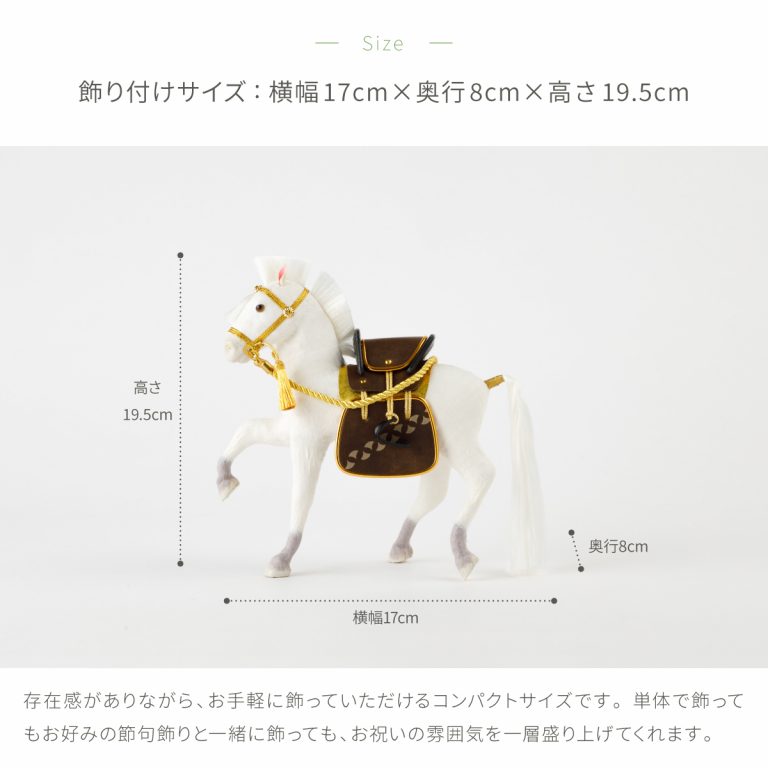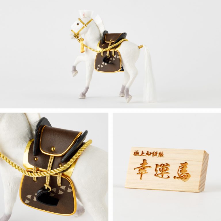 白毛が美しい6号サイズの飾り馬。高級手漉き和紙「奉書紙」を使用し、馬の毛並みを見事に表現しました。お子様の初節句や端午の節句のお祝いだけでなく、ギフトとしてもおすすめ。見栄えの良い存在感がありながら、手軽に飾れるコンパクトサイズです。兜飾りなどの五月人形とも相性抜群です。