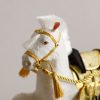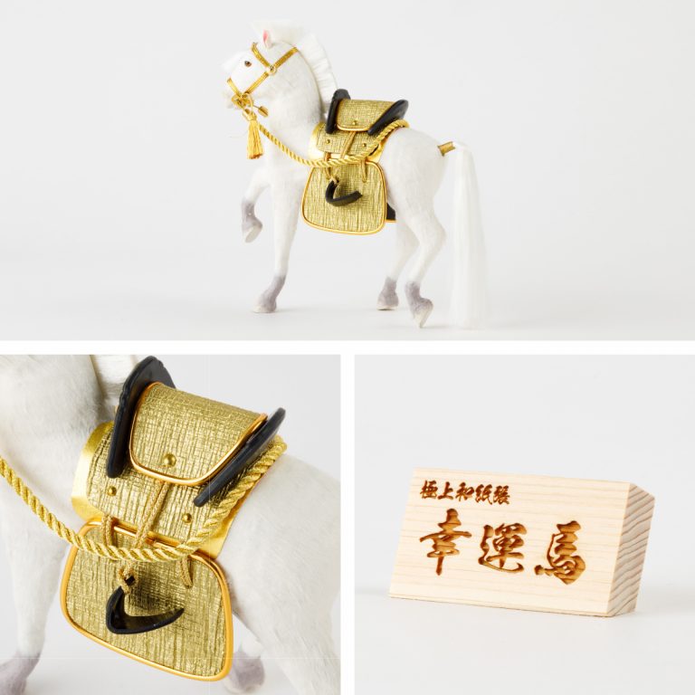 白毛が美しい6号サイズの飾り馬。高級手漉き和紙「奉書紙」を使用し、馬の毛並みを見事に表現しました。お子様の初節句や端午の節句のお祝いだけでなく、ギフトとしてもおすすめ。見栄えの良い存在感がありながら、手軽に飾れるコンパクトサイズです。兜飾りなどの五月人形とも相性抜群です。